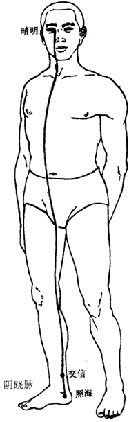 1.循行部位:阴跷脉起于足跟内侧足少阴经的照海穴,通过内踝上行,沿大腿的内侧进入前阴部,沿躯干腹面上行,至胸部人于缺盆,上行于喉结旁足阳明经的人迎穴之前,到达鼻旁,连属眼内角,与足太阳、阳矫脉会合而上行。