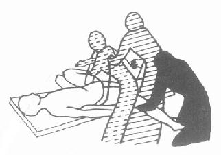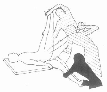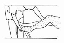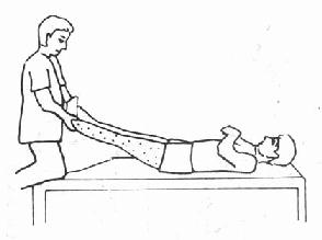 B.下肢协同作用的分离:当下肢屈肌张力强时,医师在患者仰卧位下,持双足跟向上抬起约30°,并有节律的横向摆向摆其双下肢,可抑制其屈肌的紧张如图3-2-37。