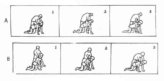④技巧:运动控制与运动发育有关,上图中的A、B、C属于!)的水平,C、D、E、F属于2)的水平,在D的基础上从一侧向另一侧移动,推肩后后和拉向前,,单侧负重,在E的基础上摇摆移动、单侧负重,在F的基础上体重转移和单侧负重等属3)的水平。在D的基础上头部作技巧运动,游离出一手作技巧运动,在E的基础上躯干做往复活动对角线型活动,游离出一手做技巧运动和F及G均属4)的水平。对运动的控制要由低级到高级地进行训练。
