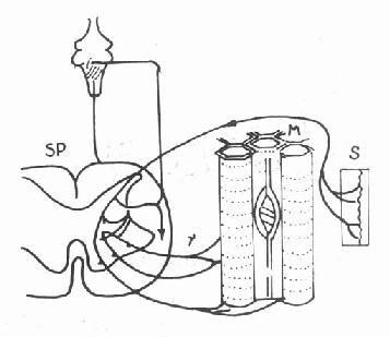 S-皮肤、SP-脊髓、M-肌梭、γ-γ传出