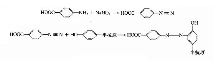 4.重氮的对氨基苯甲酸法先将对氨基苯甲酸和亚硝酸钠反应,反应产生再作用于带有酚基的半抗原,获得带有羧基的半抗原衍生物。反应式如下:
